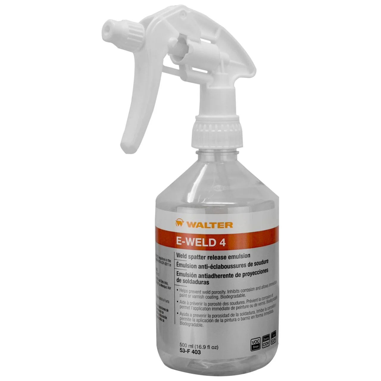 Walter E-WELD 4 (53F403) is Walter's premium anti-spatter that guarantees porosity-free welds. E-WELD 4 is guaranteed to protect work pieces from spatter and ensure clean welds, eliminating the need for time-consuming, costly rework by preventing weld porosity and weld cracks from forming. E-WELD 4 also retracts in the presence of heat, leaving the welding area clean of liquid. This is the ultimate anti-spatter for saving time and improving the quality of your work!
